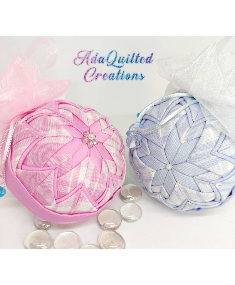 Make your baby's gender reveal extra special with this beautiful handmade quilted keepsake ornament! Amazing gift for a newborn baby boy or girl which could easily decorate the nursery. In these ornaments I've incorporated a cute cross stitched message "it's a boy" or "it's a girl" on one side and a cute cross stitched pacifier on the other side.