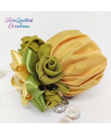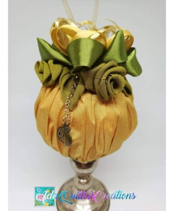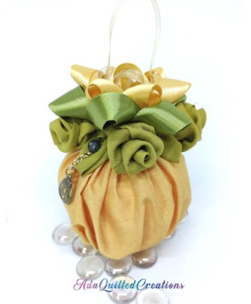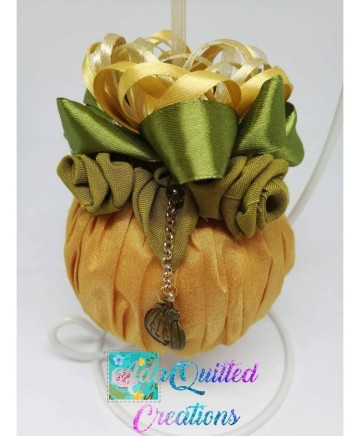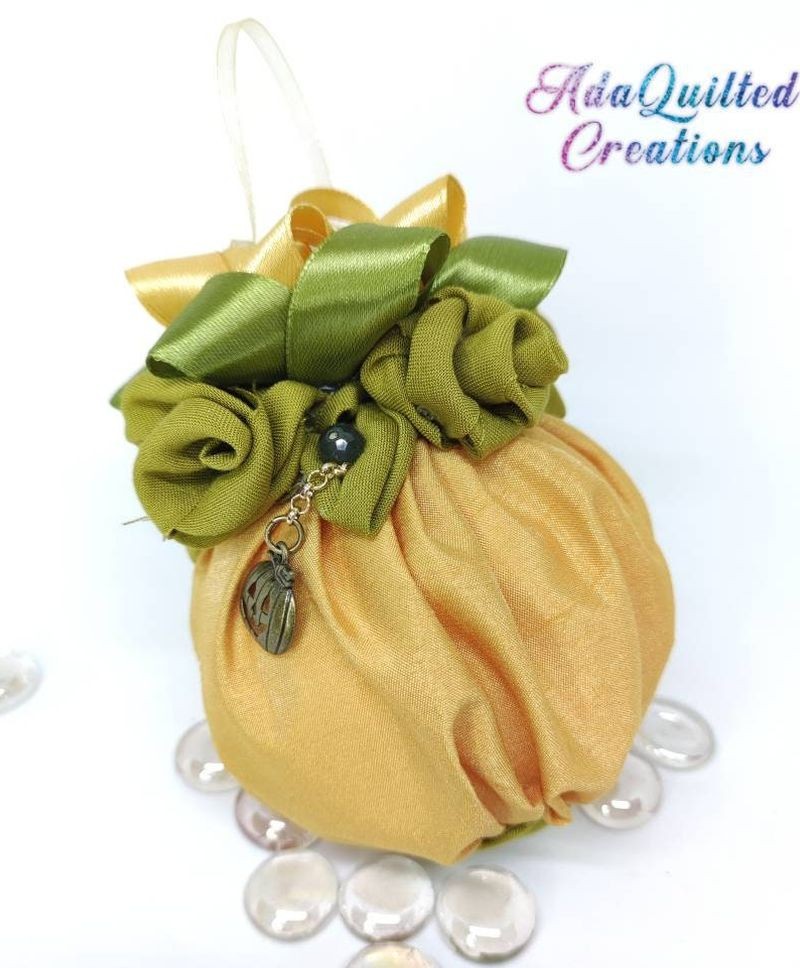 A gorgeous elegant quilted pumpkin ornament made with my original ""bon bons"" pattern! Beautiful handmade quilted fall ornament in beautiful fabrics with handmade flowers.