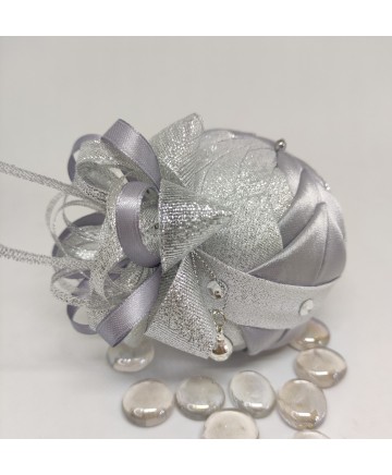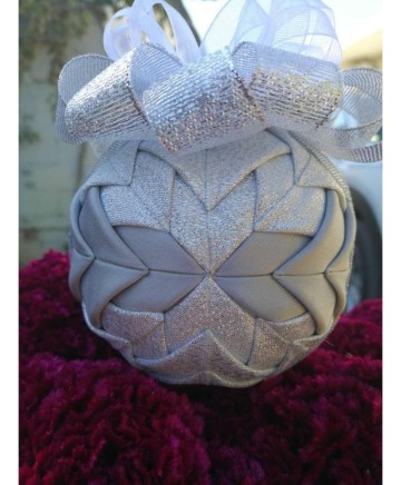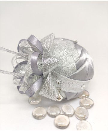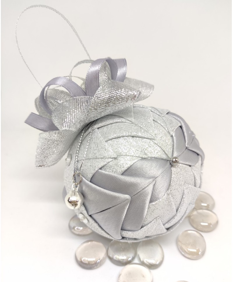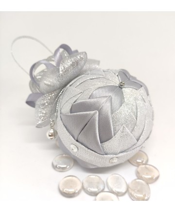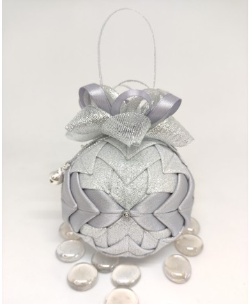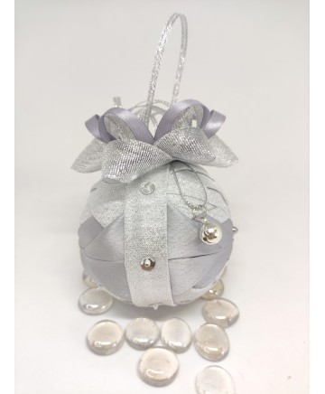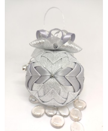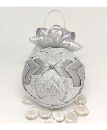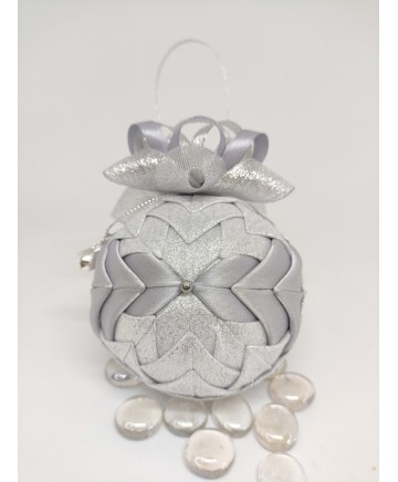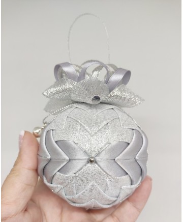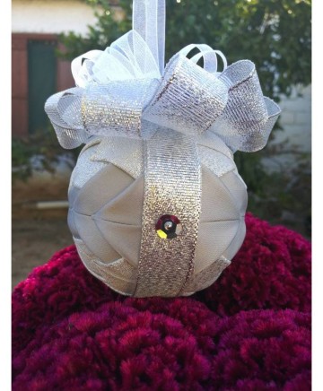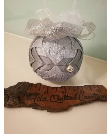 Beautiful handmade quilted Christmas ball ornament in with silver tones.