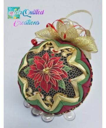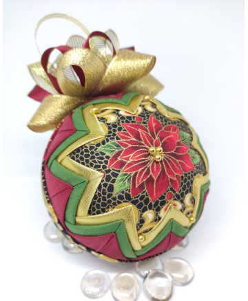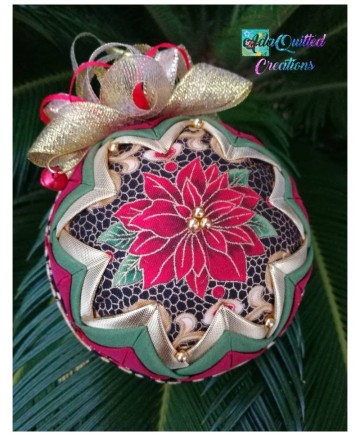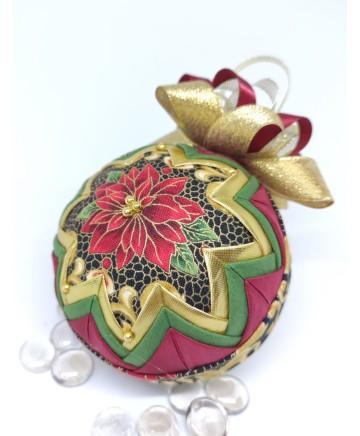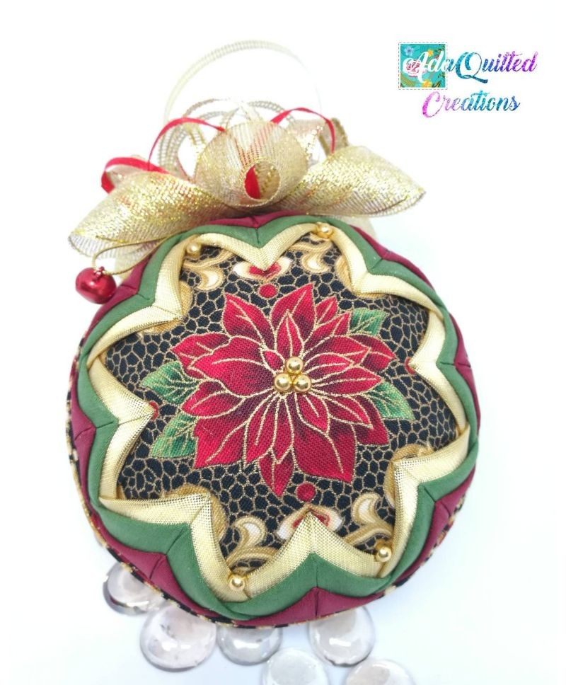 I have used shimmering gold, green cotton, dark red taffeta fabric and a gorgeous fabric featuring poinsettias in these Christmas ornaments!