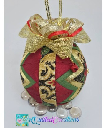 This ornament is embellished with lots of gold and red pins to accentuate even more it's beauty in design. It also has a little red ball and year charm added to it.