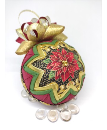 A beautiful red burgundy cross and gold details dominate this beautiful handmade quilted Christmas ball ornament.