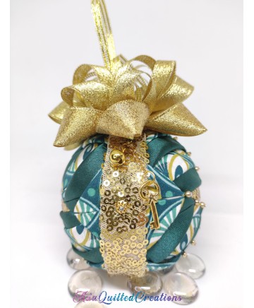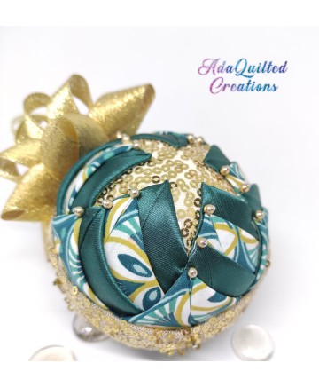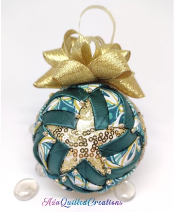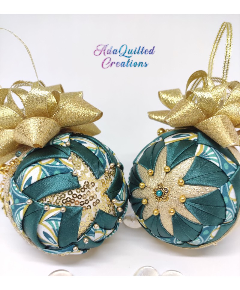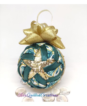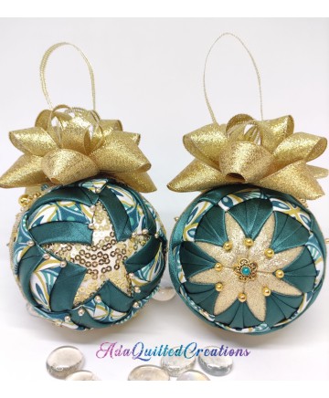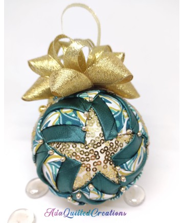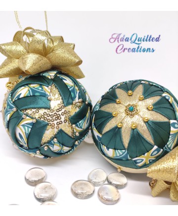 Beautiful handmade quilted ball ornaments perfect for your Christmas decor. Made with luscious petrol green satin, mandala cotton with golden details and gold lurex (or sequinned embroidered organza) in my very own designs: the "Lone Star pattern" and the "Perpetual Star pattern"