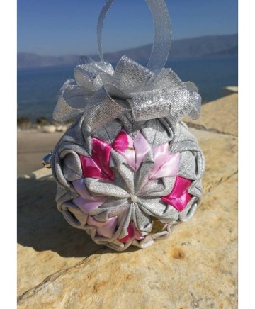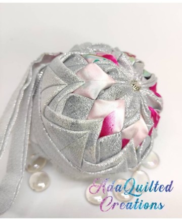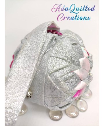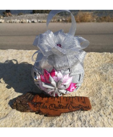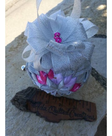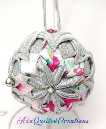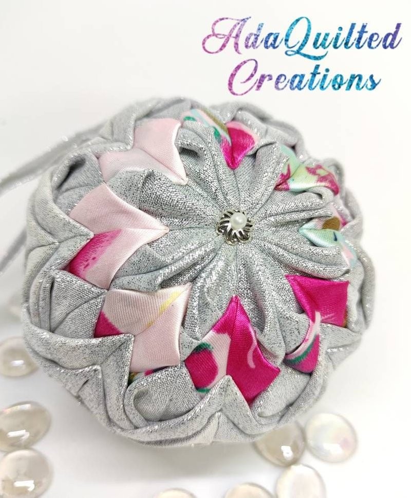 Beautiful Christmas ball ornament using a 10cm styrofoam ball quilted with shimmering silver fabric and satin. I crafted this ornament with the utmost love and care and great attention to detail in a smoke free / pet free environment, using two different fabrics.
