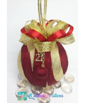 A beautiful handmade quilted ornament perfect for your Christmas coastal decor. Made with a baby pink cotton, embellished with a sparkly rhinestone on the front and a golden bead in the back. Adorned with golden trim all around and a plain hanger.