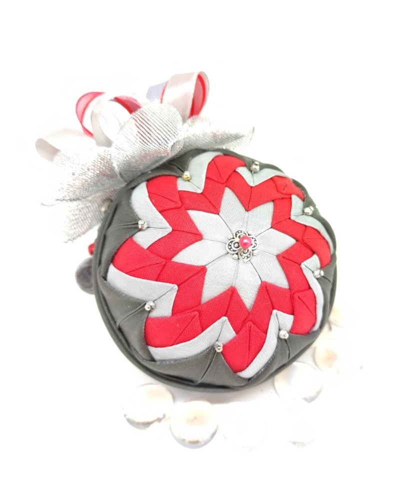 Beautiful handmade quilted Christmas ball ornament with gold satin or lurex and red satin fabric. Please notify me when ordering which design you'd like.
