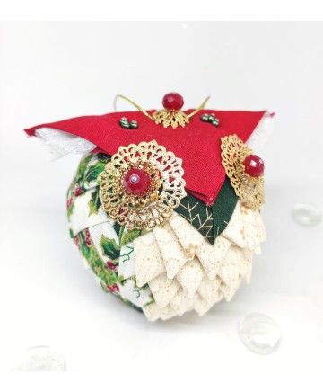 This ornament is embellished with lots of gold and red pins to accentuate even more it's beauty in design. It also has a little red ball and year charm added to it.