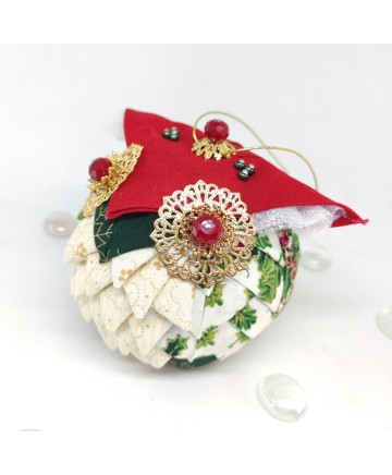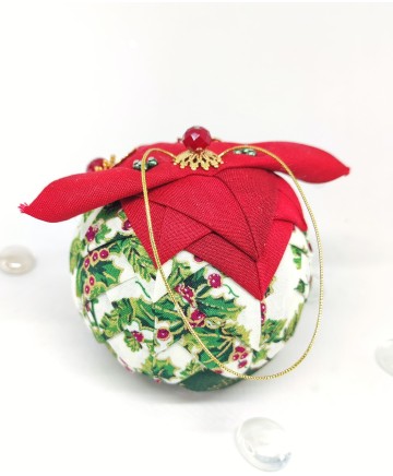 Beautiful handmade quilted Christmas ball ornaments. Classic and simple Christmas color combination but so beautiful in its simplicity! Great quality cotton fabrics in red, green and an ivory fabric featuring hollies.