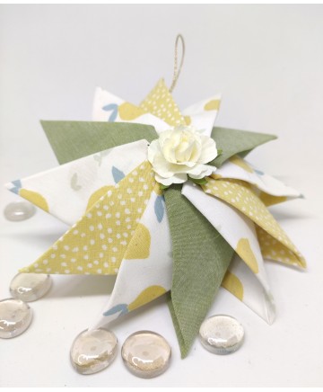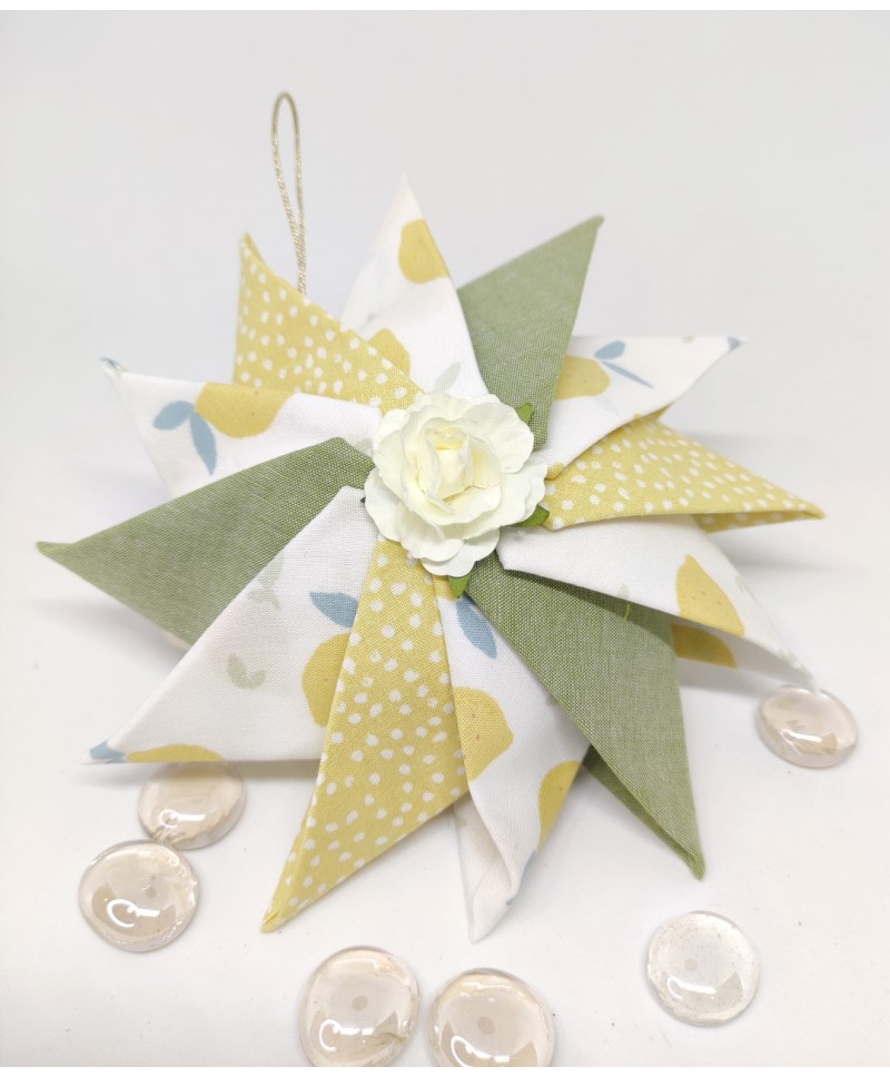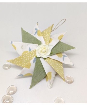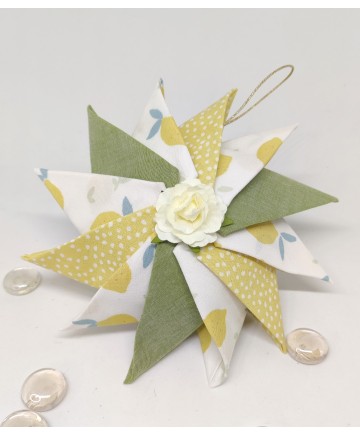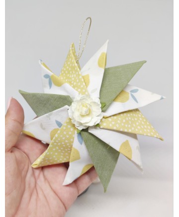 A beautiful pinwheel ornament with a lemon fabric that is so cute and vintage looking! Perfect for Spring that can decorate your home all through summer too!