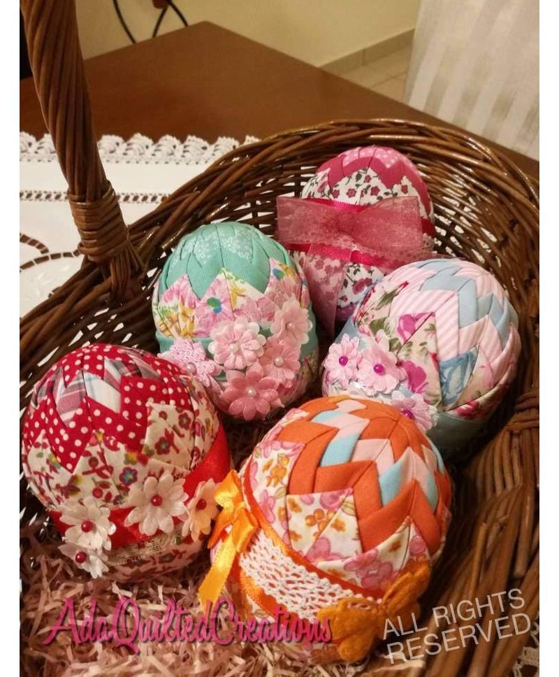 Quilted Easter eggs to decorate your home this holiday season. Light pastel coloured satin fabrics were used folded to craft these pastel Easter eggs.