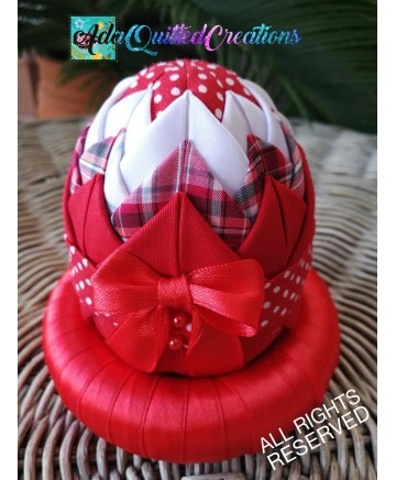 A beautiful shabby chic floral fabric on the back, red satin and green cotton on the sides embellished with red crystal beads! It also comes with its very own ribbon wreath base!!