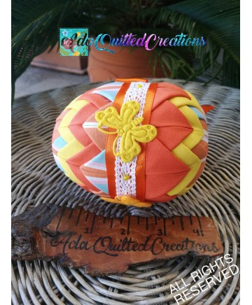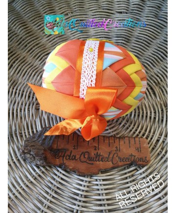 The design featured in this ornament is my very own design: "Kimekomi & folded fabric egg" pattern which can be found in the tutorial section of my shop.