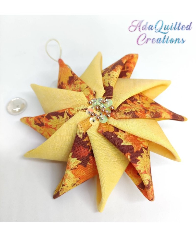 Beautiful handmade quilted ornament and a pinwheel ornament in gorgeous fall hues. Mustard and pumpkin orange taffeta paired with a gorgeous cotton featuring leaves in beautiful Autumn colours.