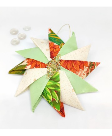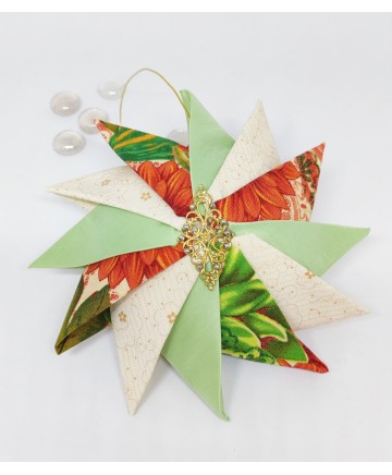 A gorgeous elegant pinwheel ornament made with light green taffeta and beautiful fall fabrics! Decorate your home this thankgiving with this beautiful decor piece.