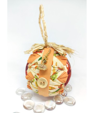 A gorgeous elegant quilted pumpkin ornament made with my original ""bon bons"" pattern! Beautiful handmade quilted fall ornament in beautiful fabrics with handmade flowers.