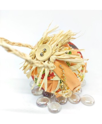Note that the wooden buttons all around the ornament and on top. The hanger is made from braided raffia strings and pieces of wheat giving the ornament a more rustic look!