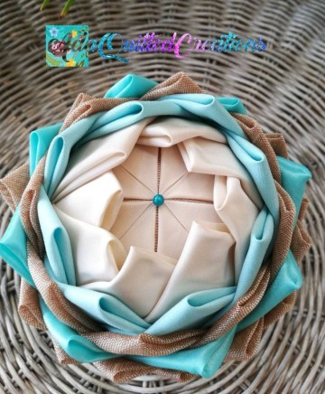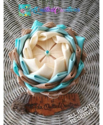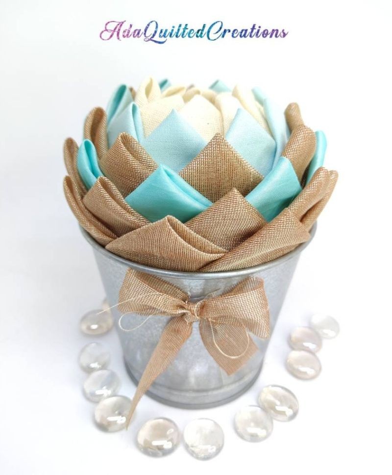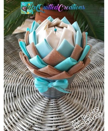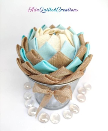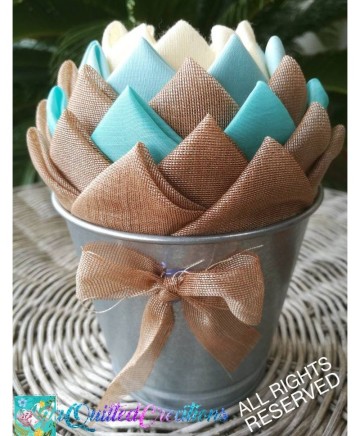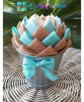 Beige and teal taffeta, aqua cotton and brown sheer fabric where used in this version to craft these flowers. The pot is metallic. So it's a flower in a pot! A few people refer to them as fabric succulents! They are beautiful any way you perceive them!