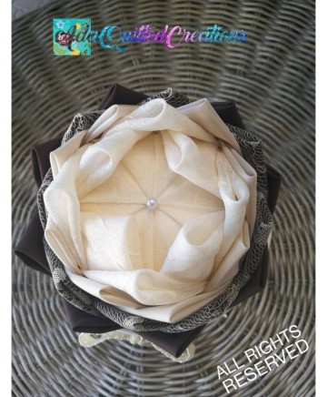 Green organza, light yellow and grey satin fabrics were used folded in this version. The pot is metallic. So it's a flower in a pot! A few people refer to them as fabric succulents! They are beautiful any way you perceive them!