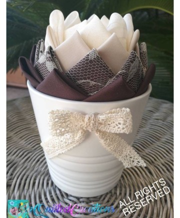 Earthy coloured cotton, satin and taffeta fabrics were used folded to craft these flowers. The pot is ceramic off white. So it's a flower in a pot! A few people refer to them as fabric succulents!! They are beautiful any way you perceive them!!