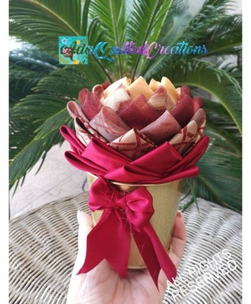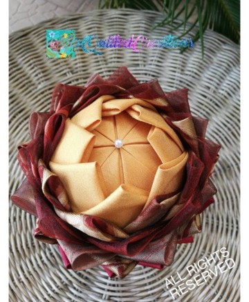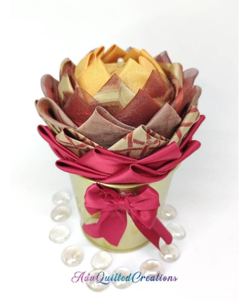Beige and teal taffeta, aqua cotton and brown and burgundy sheer fabrics were used folded to craft these flowers. The pot is gold metallic. So it's a flower in a pot! A few people refer to them as fabric succulents!! They are beautiful any way you perceive them!!