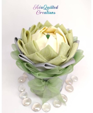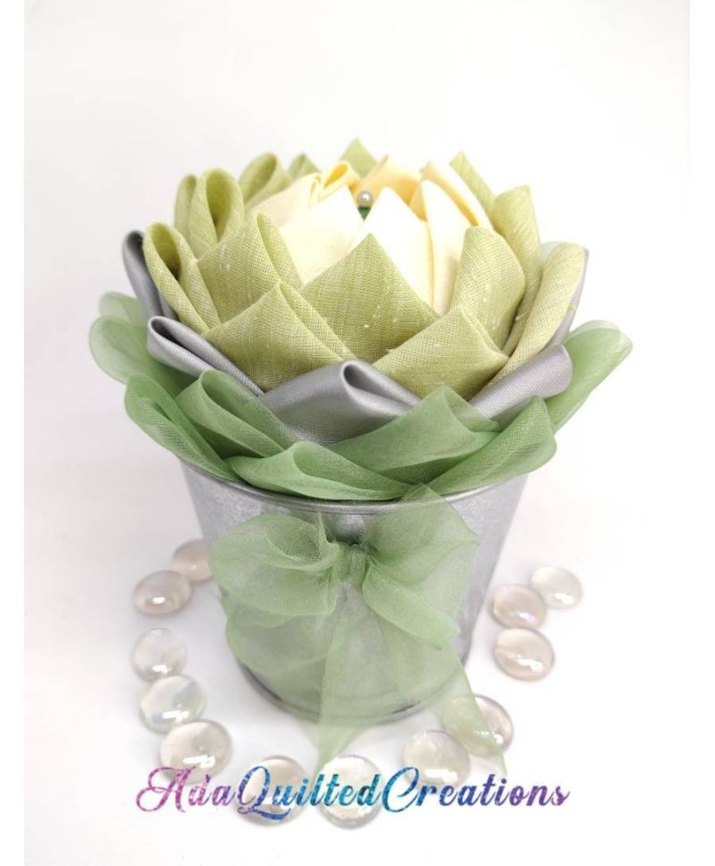 Green organza, light yellow and grey satin fabrics were used folded in this version. The pot is metallic. So it's a flower in a pot! A few people refer to them as fabric succulents! They are beautiful any way you perceive them!