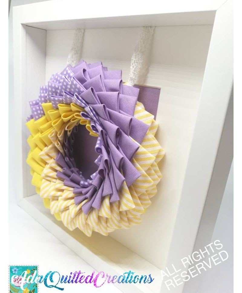 This fabric wreath comes with a laced hanger and if purchased plain it would make a beautiful wall hanging or a door hanger. A perfect addition to your little child's bedroom or a newborn baby present.