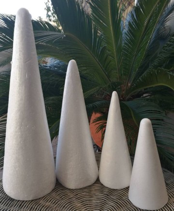 The quilted trees shown in the photos were crafted using a 40 cm and 30 cm styrofoam cones quilted with a grey satin, light silver and light pink cotton fabric. It comes in four different sizes (see the photo of all available Styrofoam cones available)