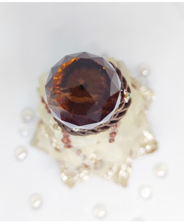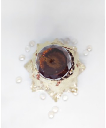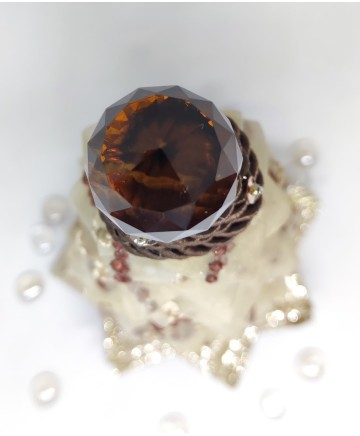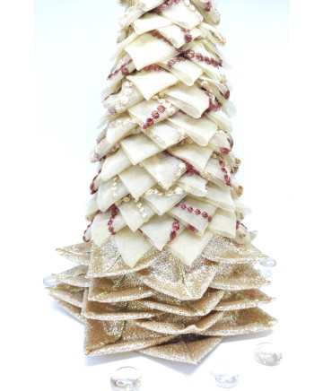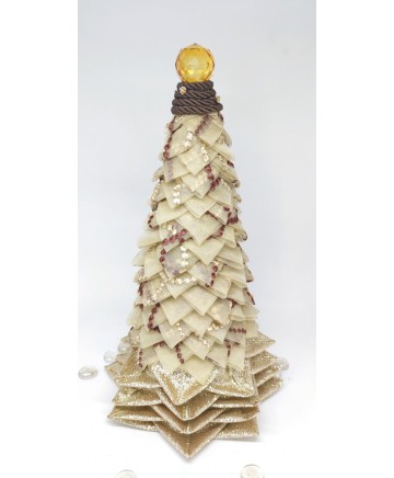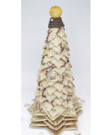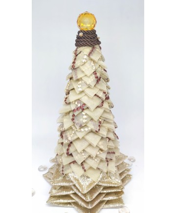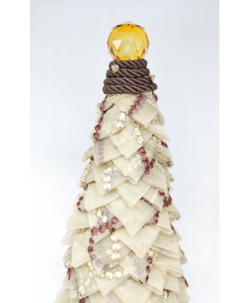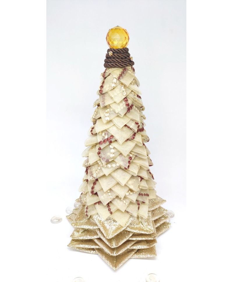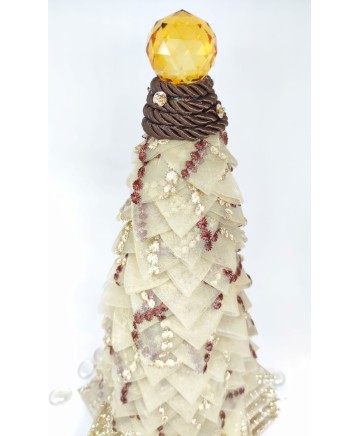 Beige organza with brown details and gold ribbon in the bottom come together in this elegant tabletop tree. Finished with a big crystal bead on top!